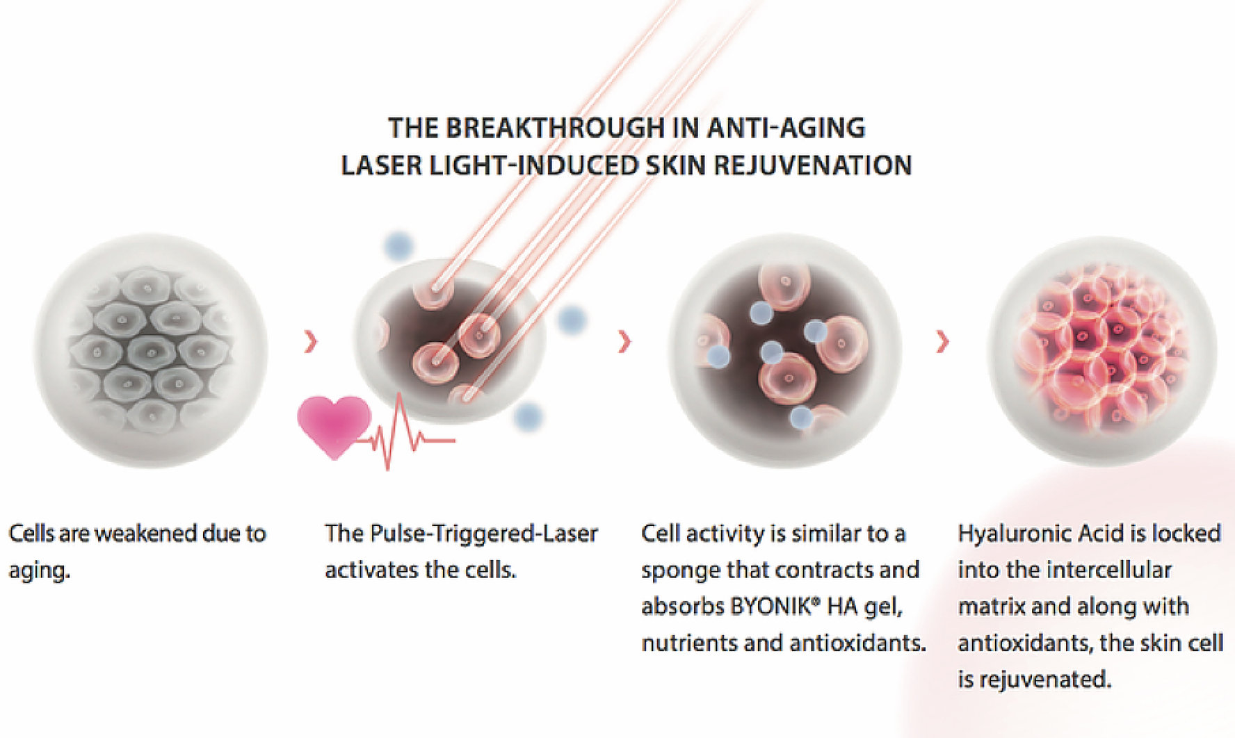 Die patentierte BYONIK®-Methode wird durch die Anpassung der Frequenz während der gesamten Behandlung noch weiter verbessert. Der Laser erfasst den ultimativen Auslösemoment, basierend auf dem eigenen Puls des Kunden, und sorgt direkt dafür, dass die Energie in alle Hautschichten gleichzeitig eingebracht wird. Der Prozess der transmembranen Konvektion ermöglicht es dem Laser, die Zelle dazu anzuregen, ihren flüssigen Inhalt teilweise freizugeben, und bei Entspannung den Transfer der maßgeschneiderten BYONIK®-Gele, die mit Antioxidantien versetzt sind, durch die Zell-Lipid-Doppelschicht zu leiten, um einen 3D-Zellschutz und eine erhöhte Zellaktivität zu erreichen.