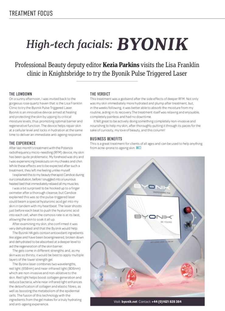 Deputy Editor at Aesthetic Medicine, Kezia Parkins, reviewed the BYONIK® Pulse Triggered Laser at Lisa Franklin Clinic Privé in the June issue of the magazine, stating “This treatment was a godsend after the side effects of deeper RFM. Not only was my skin immediately more hydrated and plump after treatment, but, in the weeks following, it was better able to absorb the moisture from my routine, aiding in its recovery.”