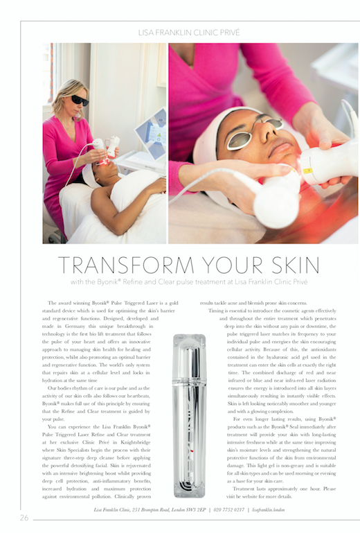 Luxury London magazine group Your London, featured the BYONIK® treatment offered at our UK Flagship clinic, Lisa Franklin Clinic Privé along with the best-selling, complementary product BYONIK® SUPREME Seal across all their London publications, including Your Knightsbridge, Your Marylebone, Your West End, Your Docklands and more.