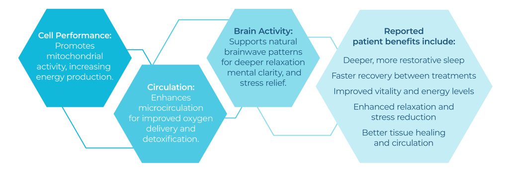 This interaction helps improve mitochondrial performance, supports microcirculation for better oxygen and nutrient delivery, and can even influence brainwave activity, promoting deeper relaxation and improved mental clarity.