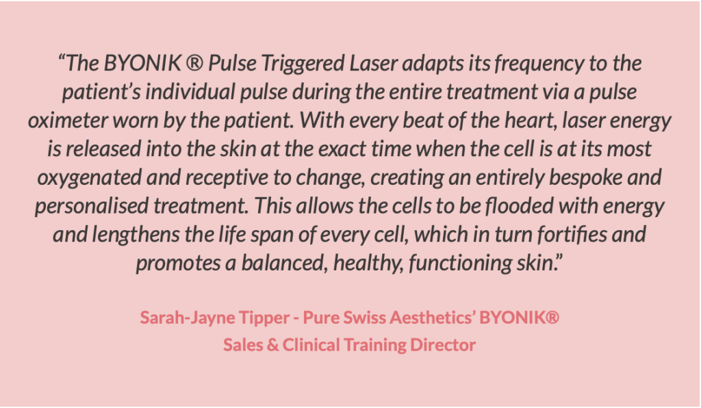 The BYONIK® Pulse Triggered Laser is the world’s ONLY and original unrivalled evidence based Low Level Pulse Triggered Laser emission technology, for direct photo biomodulation at a cellular level and dual wavelength emission for maximum results, guided by your pulse. The patented BYONIK® trilogy method, utilises a combination of non-toxic, non-thermal lasers, specially formulated Hyaluronic Acid gels and a pulse oximeter sensor worn by the patient for a truly personalised approach ensuring long term skin health. This oximeter catches the cell at its most bio-active and bio-receptive moment, so the BYONIK® can flood the cells with a triple boost of energy, hydration and nutrients penetrating all layers of the skin, powerfully reducing cellular inflammation for healthy, calm and optimised functioning skin.
