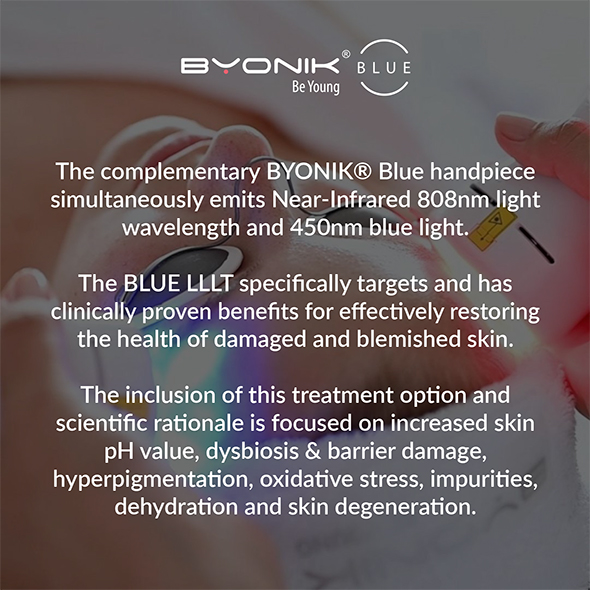 The addition of the new Blue Laser handpiece, underpinned by scientific evidence is proven to strengthen your in-clinic treatment possibilities and further enhance patients’ results by taking the BYONIK® capabilities to the next level. The compatible handpieces solidify the award-winning reputation, and clinically proven results, delivered via the BYONIK® Method.